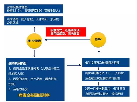 6月22日上午,天津公布了6月17日新增本土确诊病例病毒溯源的最新发现,结合流行病学史和基因测序结果,初步判断是人传人。天津市疾控中心副主任张颖介绍,通过多次排查发现,确诊病例工作所在酒店的另一名厨师血清IgM阳性,该厨师近一个月曾多次赴北京,且在餐馆、娱乐场所等公共场所长时间逗留,但此人至今未表现出任何症状。该厨师回津后与确诊病例在工作中有过交集。