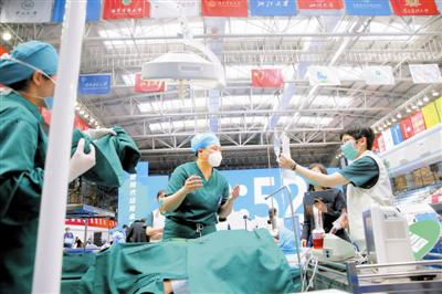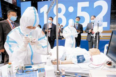 “您发热症状多久了?除了咳嗽有没有胃肠不适?”昨天下午,在冠军争夺赛赛场临时搭建的“方舱病房”内,天津中医药大学参赛选手张允芝正在对“标准化病人”进行问诊,和他同组的小伙伴们也在有序忙碌着。旁边一个偌大的方桌尤其引人注目,桌上摆放着80味不同种类的中药。这一场比赛模拟的正是在武汉方舱医院跟中医相关的救治场景,选手们要在半个小时内分工协作完成包括辨证论治的给方、针灸、拔罐、推拿等8项任务。 昨日下午,第十届中国大学生医学技术技能大赛在津落幕。本届大赛以“尚德精术培育卓越人才,中西并重共筑健康中国”为主题,共86所高校124支队伍入围在天津医科大学和天津中医药大学举行的全国总决赛。在昨天下午举行的冠军争夺赛环节,以医务人员支援武汉抗疫的英勇场景为赛题背景,重新把参赛师生带回到那场惊心动魄的抗疫战争中。