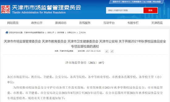 为有效保障天津2021年秋季学期校园食品安全,8月23日,天津市市场监管委、市教委、市卫健委、市公安局发布《关于开展2021年秋季校园食品安全专项监督检查的通知》,决定自2021年8月23日至12月底,在全市范围内开展2021年秋季校园食品安全专项监督检查。