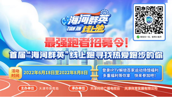 为深入贯彻落实《天津市关于促进全民健身和体育消费推动体育产业高质量发展的若干措施的通知》,推动全民健身服务和体育消费,扶持体育健身服务行业发展,助力天津打造国际消费中心城市,由天津市体育局和天津网络广播电视台联合举办的首届“海河群英”线上跑暨千万健身体验券发放活动将于6月18日正式启动。