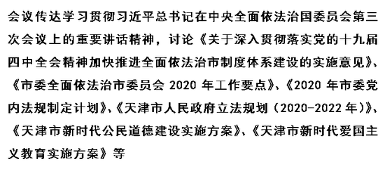 会议讨论《2020年市委党内法规制定计划》、《天津市人民政府立法规划(2020-2022年)》、《天津市人民政府2020年度立法计划》和《关于建立行政执法争议协调机制的意见》、《市委全面依法治市委员会办公室督办工作办法》。