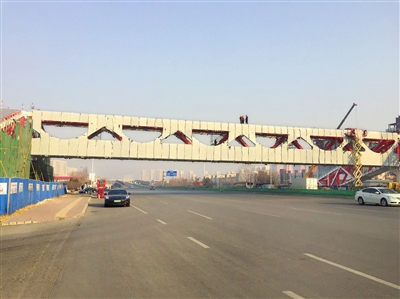 2019年12月28日,记者在津涞公路现场看到,该路段上一座人行天桥已初具规模,该桥横跨几十米宽的津涞公路且中间没有任何立柱支撑,对桥下机动车通行并无影响。