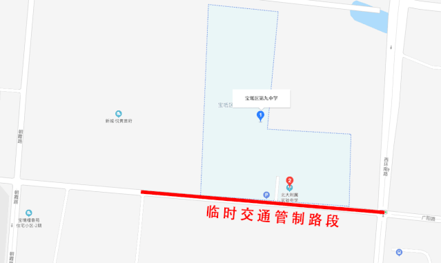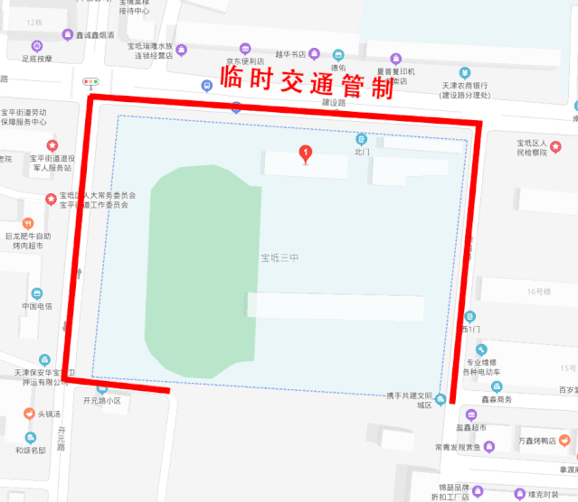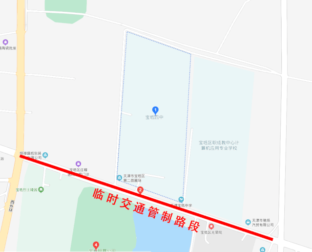 宝通路与西环路交口至宝通路宝坻中专东侧党校门前与四中西侧小路口进行临时交通管制,接送考生车辆请听从现场交警指挥单排顺向依次停放至学校门口东西200米外道路两侧。