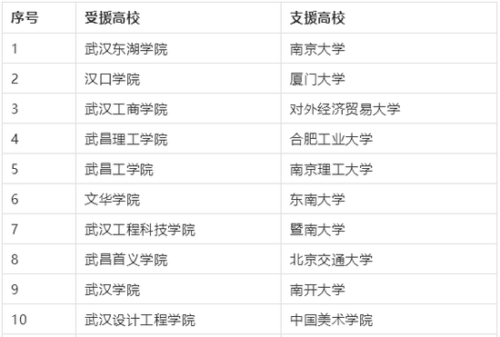 其中,南开大学帮扶武汉学院、天津医学高等专科学校帮扶湖北中医药高等专科学校、天津职业大学帮扶武汉职业技术学院。