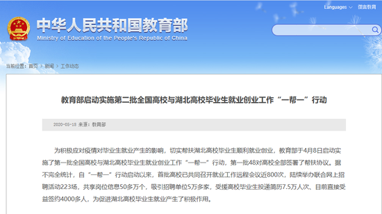 为积极应对疫情对毕业生就业产生的影响,切实帮扶湖北高校毕业生顺利就业创业,教育部于4月8日启动实施了第一批全国高校与湖北高校毕业生就业创业工作“一帮一”行动,第一批48对高校全部签署了帮扶协议。