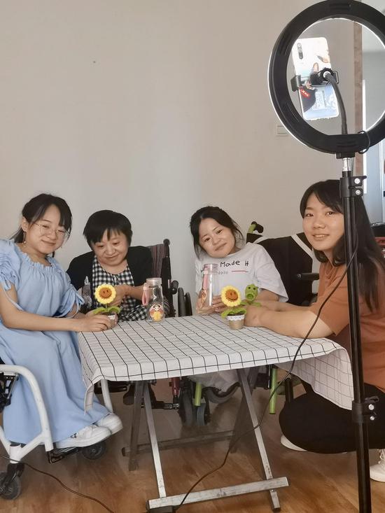 “勇敢地生活,让梦想掷地有声。”在抖音平台上,“太阳语”中心发布的二十多条作品,已经收获了上千次点赞。昨天下午,在镜头前的魏瑞红和她的团队小伙伴又一齐出镜,通过网络连线创美残疾人就业基地,给那里的残疾人做线上培训。“晚上还要准备转天的一场直播,隔几天还要去社区做‘100个爱心公益港湾’落地的直播,还要继续录制线上的分享课程。我们这么忙,是因为我们也要与时俱进啊,让网络上也多传递出残疾人的正能量好声音。”魏瑞红言语间露出自信的笑容。