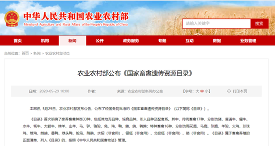 5月29日,农业农村部发布公告,公布了经国务院批准的《国家畜禽遗传资源目录》(以下简称《目录》),自公布之日起施行。