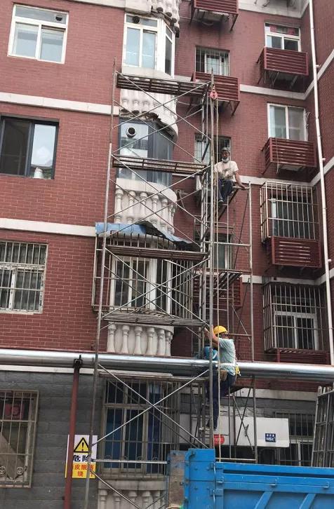 (在直播节目中,家住滨海新区塘沽杭州道街吉庆里西区的居民反映小区16号楼出现的外墙装饰砖掉落问题。节目结束后,社区找来施工队伍进行查看,并进行施工。)
