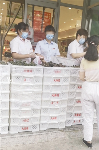 昨天10:30左右,记者在南开区咸阳路上的大桥道食品专卖店外看到,四名身穿工作服的女店员不时大声吆喝着“新鲜的粽子”,吸引了不少市民上前购买。记者仔细查看发现,这些摆在露天环境的粽子不仅没有任何防尘、防蝇措施,而且看不到生产日期、保质期等必要信息。记者上前询问这些产品的生产日期,销售人员说:“都是昨天(21日)的。”当记者进一步询问这些产品是否需要冷冻时,销售人员答复“需要冷冻”。“可现场销售的这些产品怎么都没有冷冻呢?”听到记者的追问,这些店员不仅没有正面回答,反而要求记者将录制的画面删除。当记者出示记者证后,几名工作人员依旧以该店不允许拍摄为由,要求删掉影音资料并质问:“谁给你的权利录像。”见此情况,记者立即与南开区市场监管局嘉陵道街市场监管所取得联系,两名所领导立即带领执法人员赶到现场。
