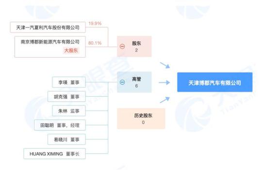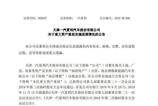 3月11日晚,天津一汽夏利汽车股份有限公司披露《关于重大资产重组实施进展情况的公告》称,企业名称和法人代表已完成变更。公告显示,2月21日,生态环境部已将企业环保信息进行变更,企业名称变更为“天津博郡汽车有限公司”,法人代表变更为“HUANG XIMING”(也就是南京博郡CEO黄希鸣)。