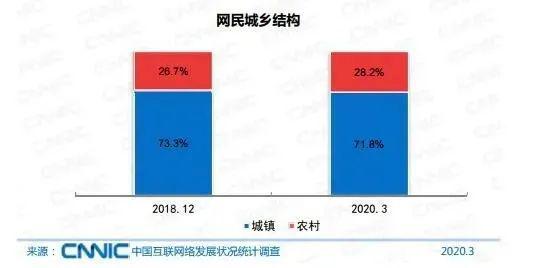 截至2020年3月,我国农村网民规模为2.55亿,占网民整体的28.2%,较2018年底增长3308万;城镇网民规模为6.49亿,占网民整体的71.8%,较2018年底增长4200万。