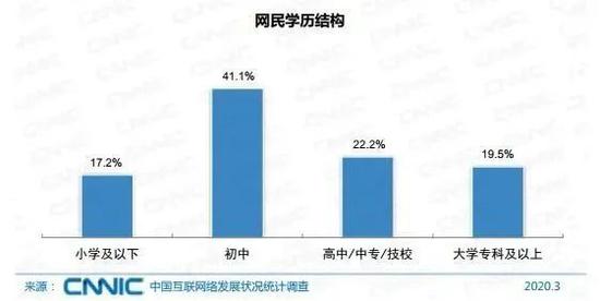 截至2020年3月,初中、高中/中专/技校学历的网民群体占比分别为41.1%、22.2%,受过大学专科及以上教育的网民群体占比为19.5%。