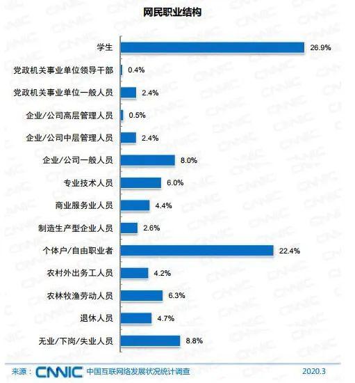 截至2020年3月,在我国网民群体中,学生最多,占比为26.9%;其次是个体户/自由职业者,占比为22.4%;企业/公司的管理人员和一般人员占比共计10.9%。