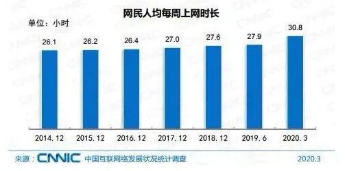 截至2020年3月,我国网民的人均每周上网时长为30.8个小时,较2018年底增加3.2个小时。受2020年初新冠肺炎疫情的影响,网民上网时长有明显增长。