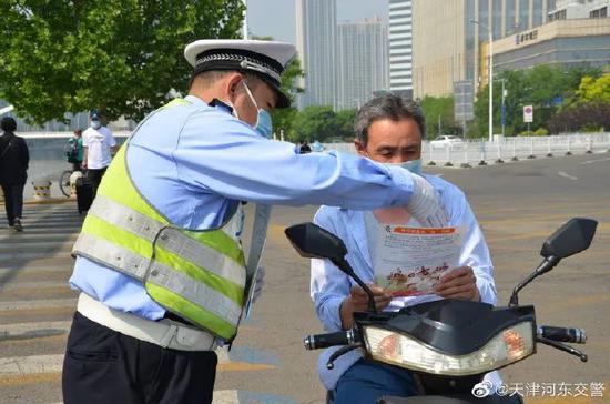 网友@大赢果611:今天骑着我的电动小嘟嘟 桑班。被警察叔叔拦下被告知六月一号起要佩戴头盔上路。望周知!