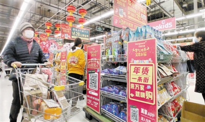 春节临近,本市各大商场超市纷纷推出多种富有创意、亮点十足的促销活动,既为商家聚拢了人气,又营造了红火的节日氛围。图为消费者在超市推出的年货一条街区域挑选年货。