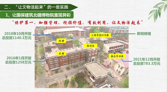 天津自然博物馆馆长张彩欣介绍说,天津自然博物馆深受我市和全国的观众喜爱,说道让文物“活”起来,她举出了一个实践的实例,让国保建筑北疆博物院重放异彩。“从2014年我们开始启动北疆博物院修缮工作,到现在已经是9年的时间了,2016年北楼陈列室陆续开放,那么2018年南楼开放,2021年12月份,北楼完成了修缮布展工作,北疆博物院的开放引起了社会各界的广泛的关注。今后我们在发展过程当中要建设一个有担当、有胸怀、有温度、有时尚、有力量的博物馆,坚定文化自信自强,使我们自然博物馆在天津市和全国的公共文化建设、生态文明建设、文旅融合发展,全域科普工作当中发挥我们的作用。”