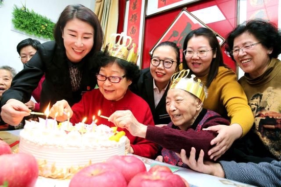 朝阳里社区工作者和志愿者一起给老人过生日
